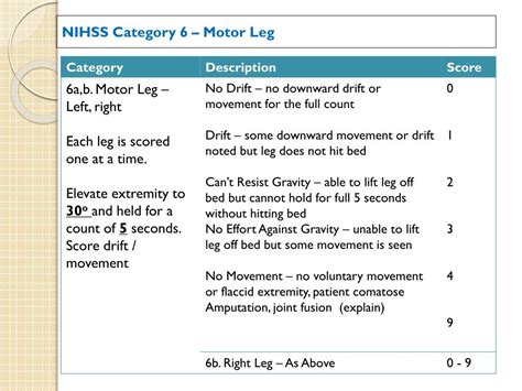 In the realm of healthcare, the NIH Stroke Scale Motor Leg stands as a critical metric in the comprehensive evaluation of neurological well-being. As an integral component of the National Institutes of Health Stroke Scale (NIHSS), this parameter holds profound significance in assessing the motor function of the lower extremities—a domain often indicative of neurological impairment. In this article, we embark on a meticulous exploration of the NIH Stroke Scale Motor Leg, delving into its nuanced implications for patient care and its role in the broader landscape of stroke assessment. With an unwavering commitment to objectivity, our discussion will traverse the clinical underpinnings of this metric, elucidating its relevance within the framework of healthcare protocols. Join us as we unravel the intricacies of the NIH Stroke Scale Motor Leg, offering a comprehensive perspective on its application and impact within the realm of neurological health.